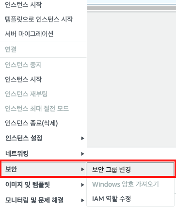 인스턴스를 오른쪽 마우스를 클릭하여 보안 그룹 변경을 들어가 줍니다.
