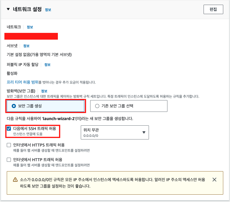 최소한의 설정을 하기위해, 이후에 보안그룹 설정을 해주겠습니다.