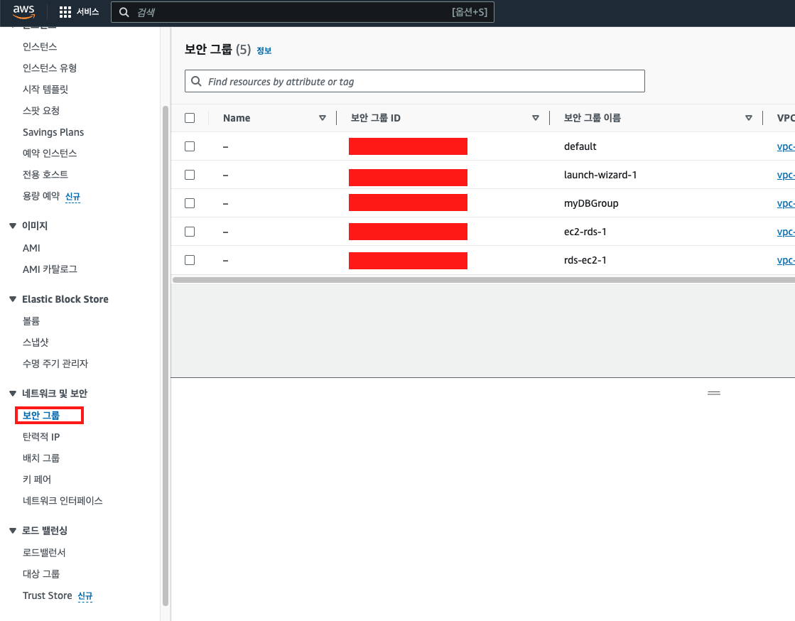 - 보안 그룹 이름 : aws 페이지 내에서 보안 그룹 페이지에서 볼 그룹 이름