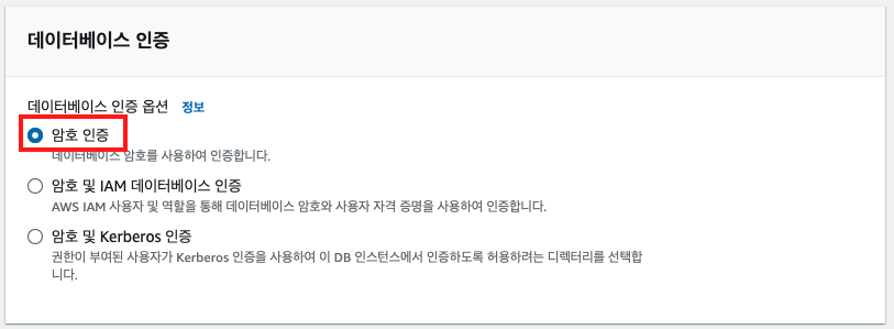 현재 db.t3.micro와 db.t4g.micro를 선택할 수 있는데, 과금요소를 제거하기 위해 버전이 낮은 것으로 선택하였습니다.