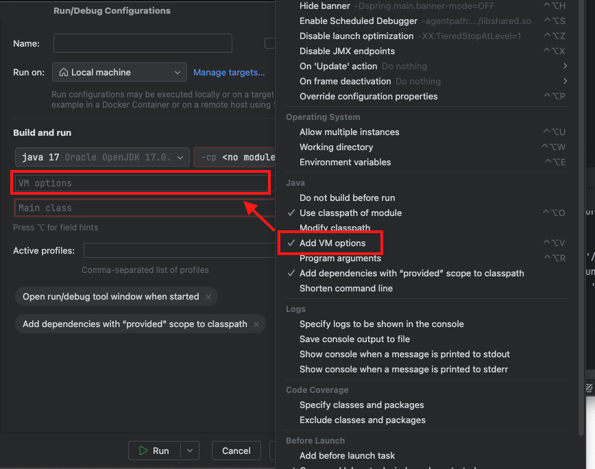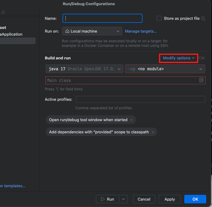 뜻은 스프링 서버 기동(실행) 할 때 local 프로필 가진 것으로 실행할거야~ 하는 옵션입니다.